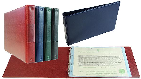 A4 Landscape pockets can be used with acid free card inserts to store two certificates, documents or photographs in each pocket. this allows storage of up to 80 certificates in each binder. There is a small clear pocket on the spine for a name card.